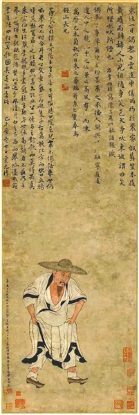 朱之蕃(1558年—1624年),字元升、号兰嵎,是明代著名画家。他的《东坡笠屐图》中,苏东坡头戴宽大的藤笠、衣缘装饰黑边,手提衣襟、眼含微笑。这幅画曾被多人收藏,苏东坡的粉丝、乾隆年间进士,著名的书法家、金石学家、诗论家翁方纲曾收藏此画并两次题跋,记述得画经过;它的下一位主人梁启超在画上也有题跋:“朱兰嵎临李龙眠所画东坡先生笠屐像,曾藏翁氏苏斋,今归饮冰室。”辗转多人后,该画现藏广东省博物馆。
