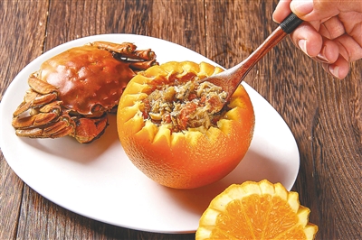 如今,浙江等地的人们依据古籍记载,进一步完善了这道菜的做法——取当季鲜橙,横切开一小盖,取出果肉、汁水备用;取出大闸蟹的蟹黄和蟹肉,放入锅内,加橙汁汆炒;出锅后,装入空橙内蒸一会儿出锅。蟹酿橙的味道融合了橙的清甜、蟹的鲜美,让人垂涎。作为一道著名的杭帮菜,蟹酿橙从古代流传至今,还曾出现在二十国集团领导人杭州峰会的国宴上。