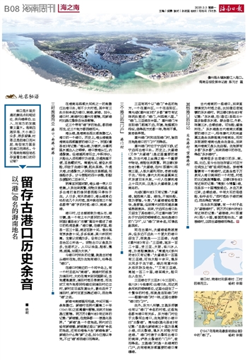 海南很多古老港口的东、南、西、北边,至今也往往存留以对应方位词加上“港”组词的地名。琼海博鳌镇有一个南港村,这是坐落于万泉河入海口南岸的一个村落,村落的北边就是博鳌港。正德《琼台志》有这样的记载:“博敖(今博鳌)港,在县东一十里博敖浦边。水自万泉江来,会潮成港。中有大石拦阻倭船,俗呼圣石。”因村落处于港的南边,因此得名“南港”。
