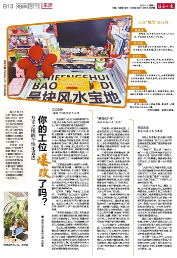 走进海口“90后”白领林微凉的办公室,在众多格子间中,她的工位很好辨认,“那个花里胡哨的桌子就是我的”。