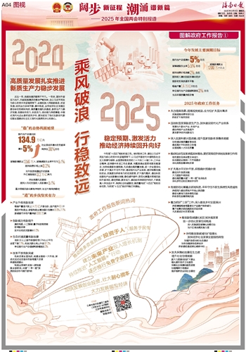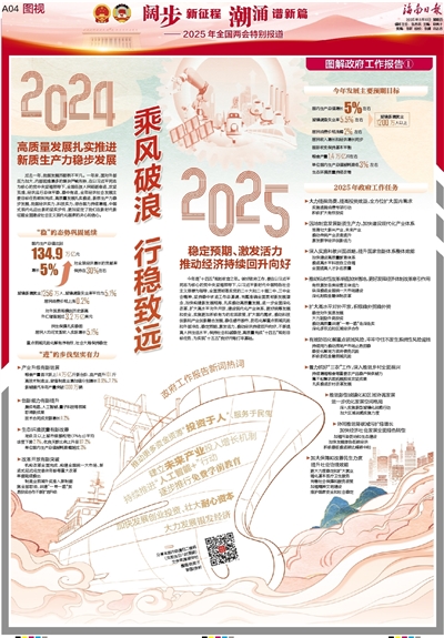 今年是“十四五”规划收官之年。做好政府工作,要在以习近平同志为核心的党中央坚强领导下,以习近平新时代中国特色社会主义思想为指导,全面贯彻落实党的二十大和二十届二中、三中全会精神,坚持稳中求进工作总基调,完整准确全面贯彻新发展理念,加快构建新发展格局,扎实推动高质量发展,进一步全面深化改革,扩大高水平对外开放,建设现代化产业体系,更好统筹发展和安全,实施更加积极有为的宏观政策,扩大国内需求,推动科技创新和产业创新融合发展,稳住楼市股市,防范化解重点领域风险和外部冲击,稳定预期、激发活力,推动经济持续回升向好,不断提高人民生活水平,保持社会和谐稳定,高质量完成“十四五”规划目标任务,为实现“十五五”良好开局打牢基础。