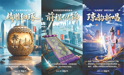 AI创意海报+视频《AI上非一般的海南》通过巧思文案与创意设计,实现AI与非遗的“跨界合作”,展现海南自贸港建设各项成就。海报中,黎锦对应自贸港建设的“前程似锦”、椰雕对应营商环境的“精雕细琢”、儋州调声对应民生福祉的“声入人心”、福山咖啡对应乡村振兴的“幸福滋味”……一语双关,相互呼应,通过全新视角解锁海南发展“成绩单”,让人耳目一新。