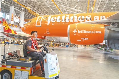 在海南自贸港一站式飞机维修产业基地里的机库,飞机在被检修。海南日报全媒体记者 袁琛 摄