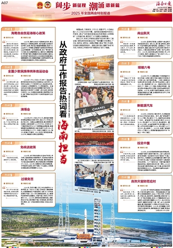 除此之外,政府工作报告还提到“成功举办第十二届全国少数民族传统体育运动会”“高质量办好进博会、广交会、服贸会、数贸会、消博会等重大展会”等工作成果,这些都与海南紧密相关。海南日报记者以撷取“热词”的方式,对政府工作报告中的“海南担当”进行了梳理。