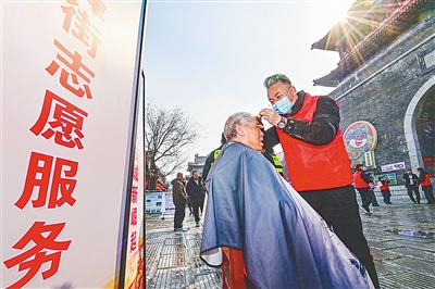 图为在山东省青州古城景区,志愿者为市民免费理发。新华社发
