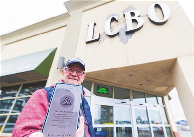 3月4日,在加拿大安大略省的奥克维尔,一名男子用手机展示酒类销售连锁商LCBO下架美国品牌酒产品的通知。
