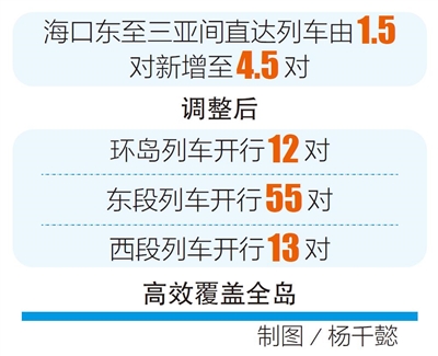 海口东至三亚间直达列车由1.5对新增至4.5对,进一步提升旅客出行效率。调整后,环岛列车开行12对、东段列车开行55对、西段列车开行13对,高效覆盖全岛。