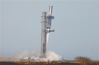 3月6日,在美国得克萨斯州博卡奇卡发射基地,火箭第一级助推器被发射塔以“筷子夹火箭”方式回收。