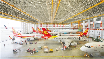 作为海南民企“龙头”之一的海航航空集团,正着力壮大包括飞机维修在内的航空上下游产业链。图为境内外航司飞机正在该公司定检机库接受检修。 海南日报全媒体记者 袁琛 摄