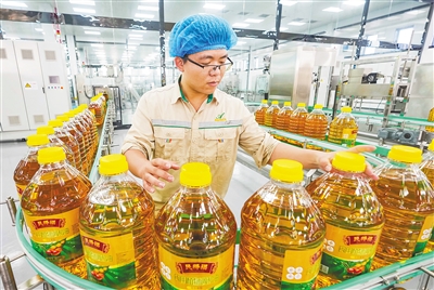 洋浦经济开发区保税港区,海南澳斯卡国际粮油有限公司工人对成品油进行包装。海南日报全媒体记者 陈元才 摄