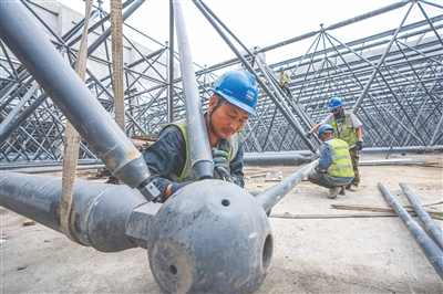 3月12日,在位于文昌国际航天城航天总装发射区的海南卫星超级工厂项目建设现场,工人加紧进行钢结构等施工作业。