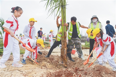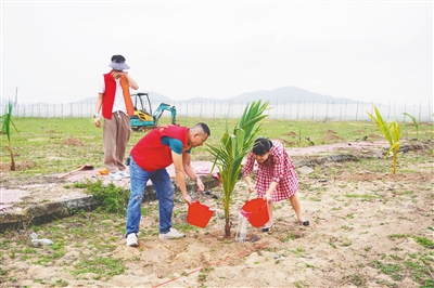 3月12日,海口市美兰区组织开展植树活动,美兰区各级干部职工、志愿者、学校师生等600多人组成义务植树队伍,在北港岛种下360余株椰子树。