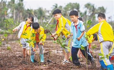 3月12日,在海南东寨港国家级自然保护区,海口市演丰镇中心小学学生在种植红树植物。海南日报全媒体记者 李天平 摄