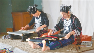 来自五指山的两位非遗传承人现场演示黎锦编织技艺。海报集团全媒体中心记者 余育桑 摄