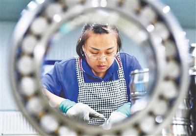 工人在河北省邢台市临西县一家轴承生产企业车间工作。