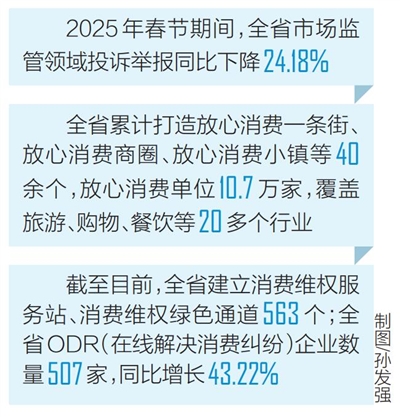“我们持续畅通消费投诉举报渠道,广泛推行线下购物无理由退货、先行赔付、ODR(在线解决消费纠纷)等消费者权益保护制度,推动消费纠纷源头化解、快速化解。”肖亮介绍,截至目前,全省建立消费维权服务站、消费维权绿色通道563个;全省ODR企业数量507家,同比增长43.22%。