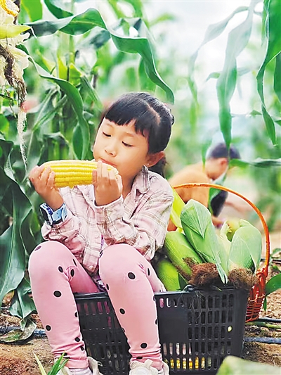 三亚崖州区,儿童采摘品尝新品种鲜食玉米。