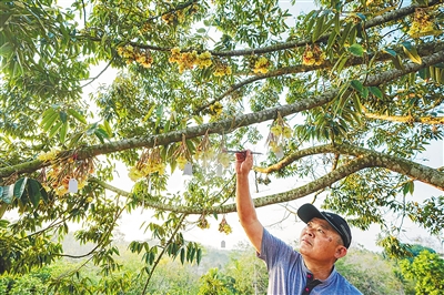 保亭黎族苗族自治县七仙岭全球热带水果博览中心园内,榴莲老树花朵盛开。(资料图)