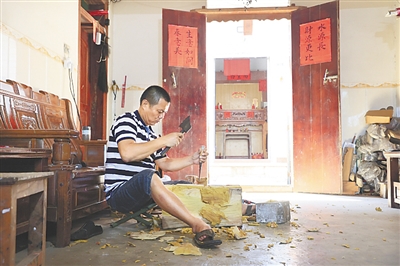 他一手执一把小刻刀,一手拿一块菠萝格木料,正在雕刻一尊“万天雷首”,已经雕刻出基本模型,正在进行细节的打磨修饰。他的身边,还摆满了未完工的木雕作品和各类木料。“订单所需的作品大小不一,一般大的能高两三米,小的就只有手指头大小。”何光云说,一般雕刻一件简单一点的作品需要三五天,复杂的则需要半个月。如今他和团队每年都能雕刻五六十件作品。