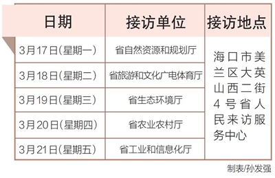 3月17日至21日,省自然资源和规划厅、省旅游和文化广电体育厅、省生态环境厅、省农业农村厅、省工业和信息化厅相关负责人将在海口市美兰区大英山西二街4号省人民来访服务中心接访群众。