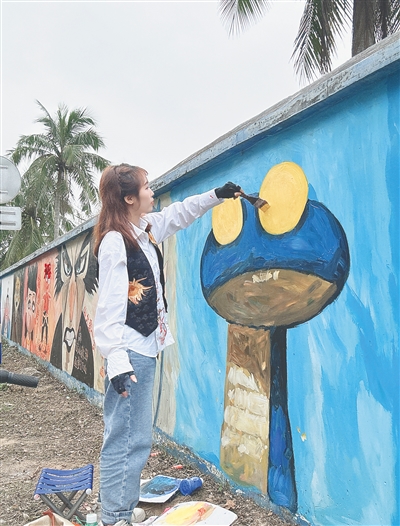 这幅墙绘的作者是来自重庆的“80后”黄天蓝,她是一名旅居博鳌的园林景观设计师。近日,接受海南日报全媒体记者采访时,黄天蓝表示,“生活太匆忙,我想在蓝天下、大海旁用画笔让这座小城变得更温暖、更美丽。”
