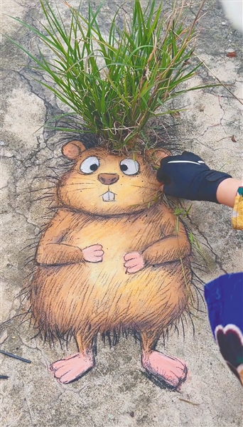倘若你漫步在博鳌湾海岸线上,或许会在某个不经意的角落里发现黄天蓝的绘画作品:分叉的杂草在她的巧手下变成鸵鸟俏皮可爱的“双马尾”;从水泥缝里顽强长出来的杂草,被她赋予新的生命,成为卡皮巴拉别具一格的“头发”。