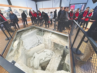 北京前门大街正阳桥遗址考古方舱内的镇水兽。