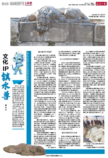 ■ 杨江波前不久,位于北京前门大街的正阳桥遗址考古方舱对外开放,方舱内陈列的镇水兽正式与市民游客见面。在我国,镇水兽出现的时间可追溯至秦汉时期。成书于汉代的《蜀王本纪》记载:“江水为害,蜀守李冰作石犀五枚,二枚在府中,一枚在市桥下,二枚在水中,以厌水精,因曰犀牛里。”古人用石料等制作镇水兽放于水边,希望起到镇压水害的作用。如今,虽然民间已无此习俗,但保留下来的各类镇水兽仍有着重要的历史文化价值。