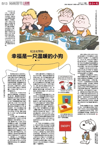 ■ 丁乔1950年10月4日,一只黑白色的可爱比格犬第一次出现在一部名叫《花生漫画》的连载漫画中。它有着小小的个子和大大的脑袋,总是喜欢眯缝起两只眼睛,双手叉腰站得笔直。在后面的日子里,我们跟着它和主人查理·布朗的生活轨迹,认识了许多同样可爱的角色。今年,我们的史努比即将度过它的75岁生日。让我们重温和这位小伙伴一起度过的岁月吧。