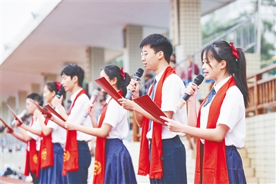 “强国有我,是书本中淬炼成钢的青春,是操场上震碎星辰的呐喊……”今年2月,在海南中学开学典礼上,千余名初高中学生齐声诵读,用铿锵有力的话语表达对祖国的热爱与对未来的憧憬。