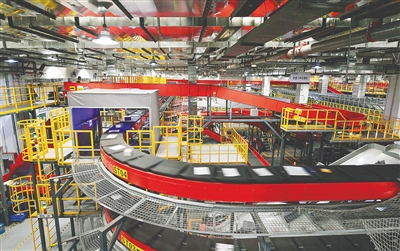 在顺丰速运天津全自动中转枢纽,快递包裹在全自动分拣线上传送。新华社发