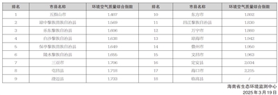 按照《环境空气质量标准》(GB3095-2012)及修改单、《环境空气质量评价技术规范(试行)》(HJ663-2013)和《城市环境空气质量排名技术规定》(环办监测〔2018〕19号)评价,2024年,全省环境空气质量优良天数比例为99.4%,其中优级天数比例为83.0%,良级天数比例为16.4%,轻度污染天数比例为0.6%,无中度及以上污染天。环境空气质量排名靠前的市县分别是五指山市、琼中黎族苗族自治县和乐东黎族自治县,排名靠后的市县分别是海口市、定安县和文昌市。受台风“摩羯”影响临高县站房损坏,2024年各项污染物有效天不足,不参与排名统计,全省17个市县环境空气质量排名如右: