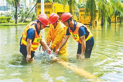 2024年9月8日,在秀英区椰海大道与金福路交叉口,排水工人在积水区域排水。(本版图片均由海口市水务局供图)