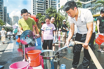 2024年9月8日,超强台风“摩羯”过境后,海口市水务集团派出送水车到永和花园,为市民提供服务。
