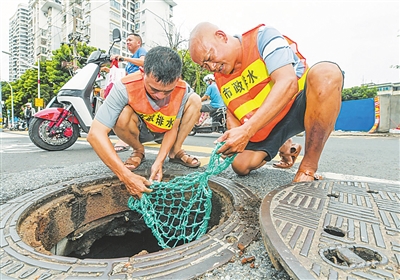 在龙华区金龙路附近,市政排水工人打开井盖铺设防坠网。