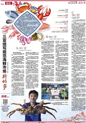■ 海南日报全媒体记者 李梦楠三亚湾,晨曦中,帝王蟹的螯足划破粼粼波光,石斑鱼在循环水暂养池中游弋……游客许繁雪拎着用“诚信筐”装好的海鲜,扫码查看商户信用星级。海鲜明码标价、交易全程监控,“这样的消费场景让人安心”。