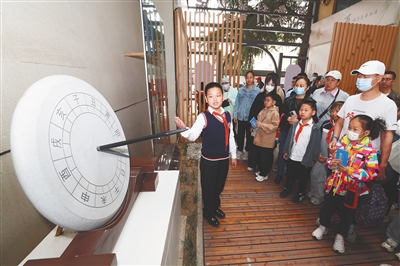 图为在石家庄市气象局市民开放日活动中,“气象小讲解员”为观众讲解日晷用途。新华社发
