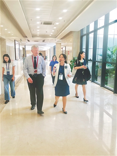 蒋秀娟(右一)在博鳌超级医院接待外宾。