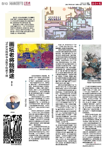 ■ 吴源画坛奇人吴地林常破庸常,年近耄耋仍在画“新画”,在海南美术圈被传为佳话。近日,吴地林数字绘画展在海口骑楼老街开幕,这是海南首次举办数字绘画个展。