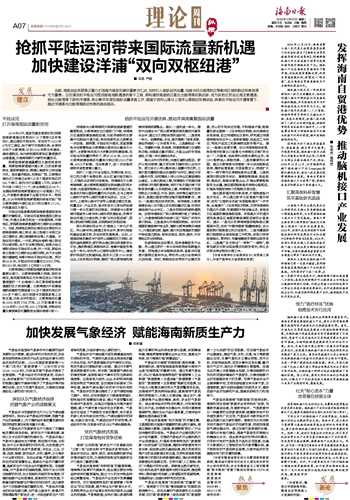 ■ 肖路 严涵当前,海南自由贸易港正着力打造国内国际双循环重要交汇点,加快引入国际经济流量,加强与环北部湾地区等毗邻区域的联动发展显得尤为重要。正在建设的平陆运河是西部陆海新通道的骨干工程,将构建西南部地区直达北部湾港的新动脉,成为该地区货运出海主要通道。地处北部湾港下游的洋浦港,有必要尽早谋划国际流量承接工作,借鉴宁波舟山港与上海洋山港联动发展经验,探索在平陆运河开通背景下,推动洋浦港与北部湾港联动发展的具体路径。