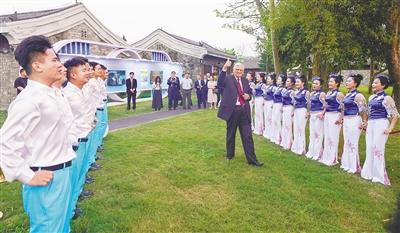 3月25日,在博鳌东屿岛文化公园,20位来自儋州的青年唱起欢快的儋州调声欢迎八方来客,外国嘉宾竖起大拇指为他们点赞。