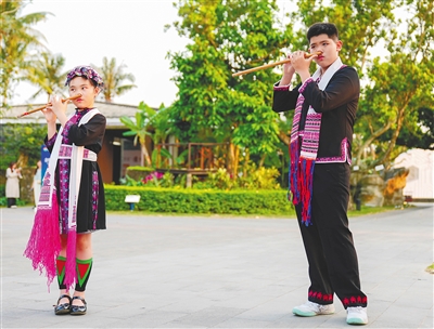 本报博鳌3月25日电(海南日报全媒体记者刘晓惠)身穿民族服装,吹着鼻箫……3月25日傍晚,来自保亭黎族苗族自治县9岁的林熙雯和14岁的陈虎化身海南文化使者,以悦耳的箫声为中外嘉宾开启了一段独特的海南文化体验。当天,全球自由贸易港发展论坛主题晚餐会在东屿岛文化公园举办,200多名嘉宾来到这里看展览、叙旧情、交新友。在这场融合国际经贸对话与文化交流的盛会中,海南非遗元素以动静相宜的方式贯穿始终。“看到这么多外国来宾我好激动,我给他们吹奏了我最拿手的曲子。”林熙雯特地穿上苗族服装,小小年纪的她,学习鼻箫已有两年,虽然尚不能完全理解“非物质文化遗产”的定义,但小姑娘清楚自己的使命:“要让更多人听见海南的声音。”