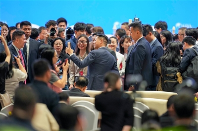 3月25日,在博鳌亚洲论坛2025年年会举行的全球自由贸易港发展论坛上,参会嘉宾自拍留念。