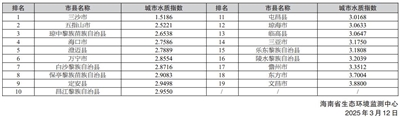 按照《地表水环境质量标准》(GB3838-2002)、《地表水环境质量评价办法(试行)》(环办〔2011〕22号)和《城市地表水环境质量排名技术规定(试行)》(环办监测〔2017〕51号)等评价,2025年1—2月,全省地表水总体水质为优,监测的192个断面(点位)中:水质优良(Ⅰ~Ⅲ类)断面(点位)占95.4%,无劣V类断面。19个市县水环境质量按由好至差排名分别为:三沙市、五指山市、琼中黎族苗族自治县、海口市、澄迈县、万宁市、白沙黎族自治县、保亭黎族苗族自治县、定安县、昌江黎族自治县、屯昌县、琼海市、临高县、三亚市、乐东黎族自治县、陵水黎族自治县、儋州市、东方市和文昌市。详见右表: