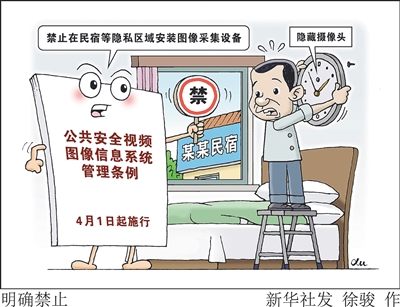 《公共安全视频图像信息系统管理条例》4月1日起施行。条例明确,禁止在民宿、宿舍、更衣室等能够拍摄、窥视、窃听他人隐私的区域、部位安装图像采集设备设施。对违法安装图像采集设备设施,或者非法对外提供、公开传播视频图像信息的,没收设备设施、删除视频图像信息、给予罚款处罚;偷窥、偷拍、窃听他人隐私的,依法给予治安管理处罚。