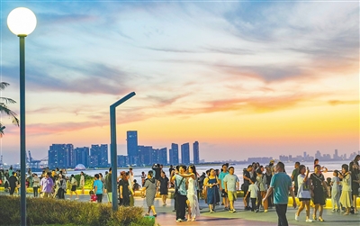 市民游客在海口湾畔的云洞图书馆附近拍照留念。袁才 摄