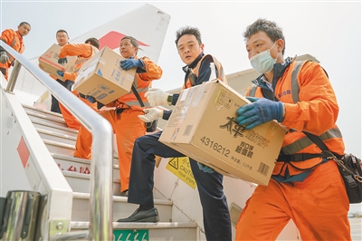 3月30日,在昆明长水国际机场,工作人员往飞机上搬运救援物资。