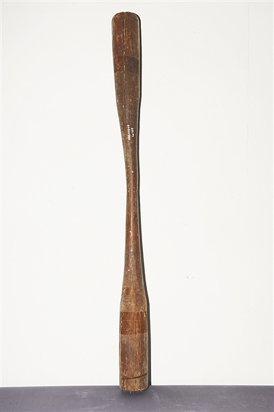 在海南省博物馆“仙凡之间”海南风情陈列展中,一组黎族木臼、木杵古朴而独特。木臼高约一米,配套的木杵接近成人高,因长期使用杵身中段留下了磨痕。这是黎族群众平日里使用的舂米工具,也是他们“三月三”跳舂米舞的道具。