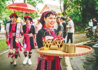 近年来,“三月三”的民俗活动出现了一些新元素,比如在歌舞之外,增加了非遗技艺展示、书画展示等环节,一些商家适时推出五色粽、山栏咖啡等特色产品,“三月三”已发展成为一个集民俗、文化、旅游、商贸于一体的节日。