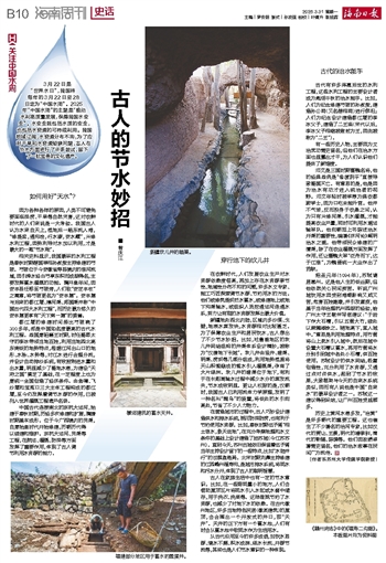 ■ 曾庆江3月22日是“世界水日”,我国将每年的3月22日至28日定为“中国水周”。2025年“中国水周”的主题是“推动水利高质量发展,保障我国水安全”。水安全既包括水质的安全,也包括水资源的可持续利用。我国地域辽阔,水资源分布不均,为了应对干旱和水资源短缺问题,古人在节水方面进行了许多尝试,留下了一批宝贵的文化遗产。